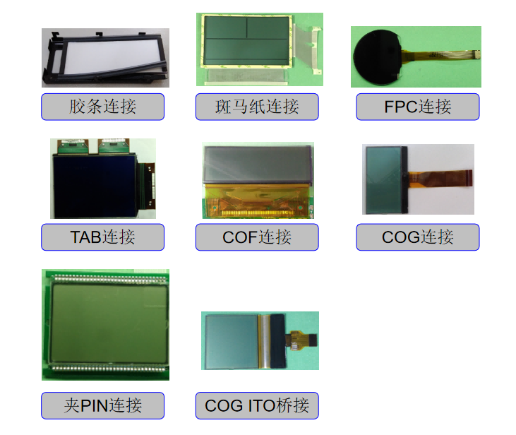 Ezen túlmenően a csatlakozási mód ugyanilyen fontos. A hagyományos zebraszalag/elasztomer csatlakozásoktól a fejlettebb FPC, TAB és COF csatlakozásokig az optimális elektromos csatlakozási megoldást tudjuk kiválasztani, amikor az LCD képernyő összetevőit testre szabja, a jelátviteli követelmények és a térbeli elrendezés alapján.